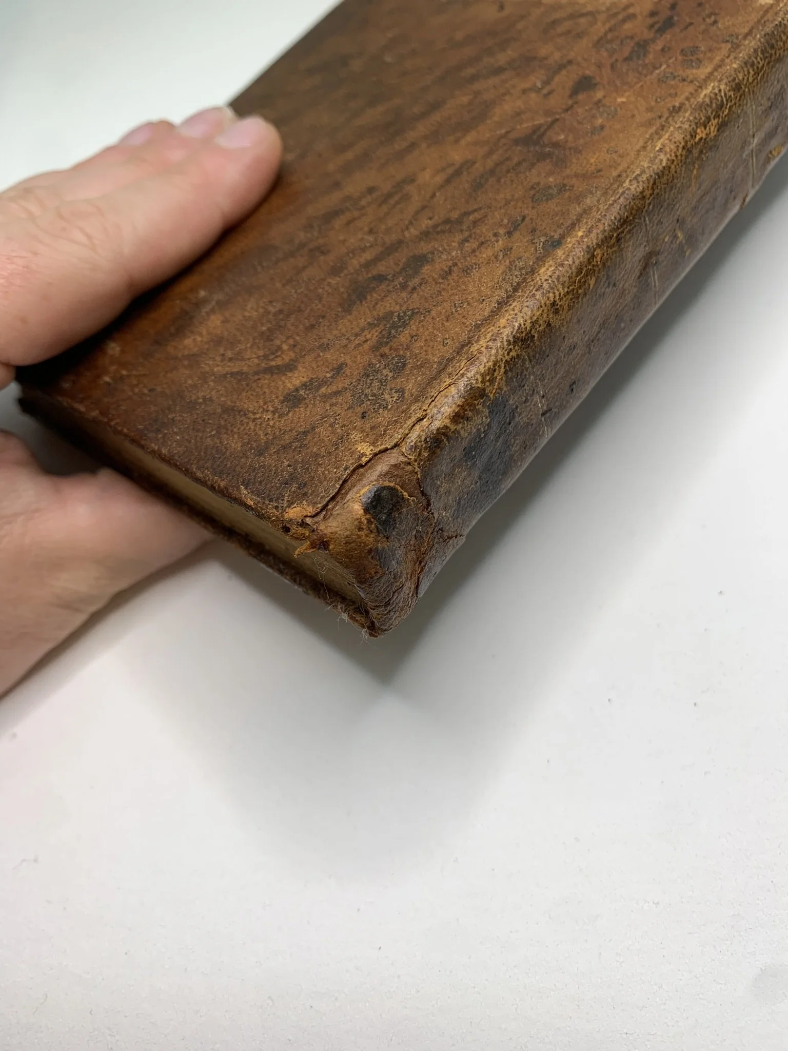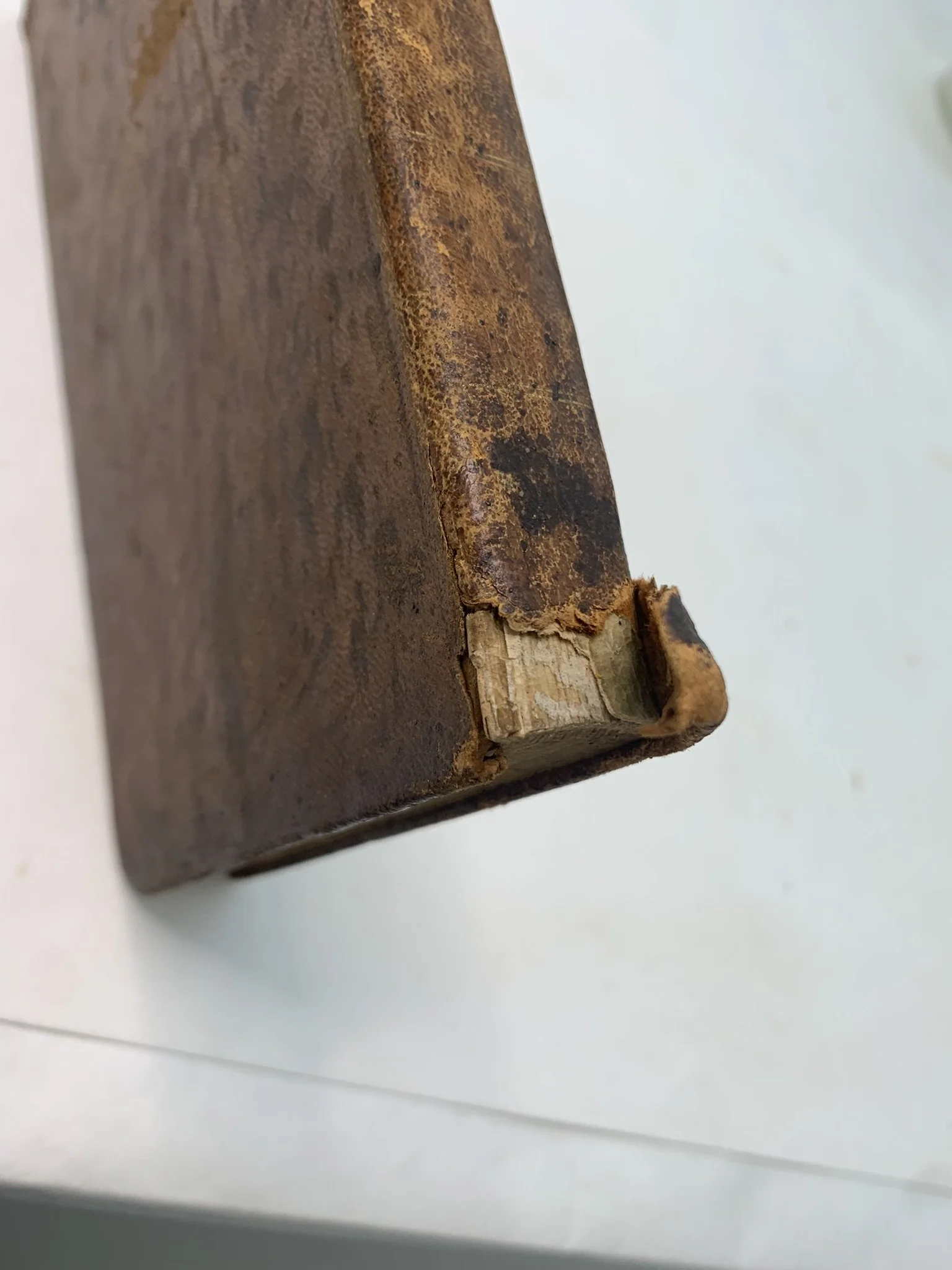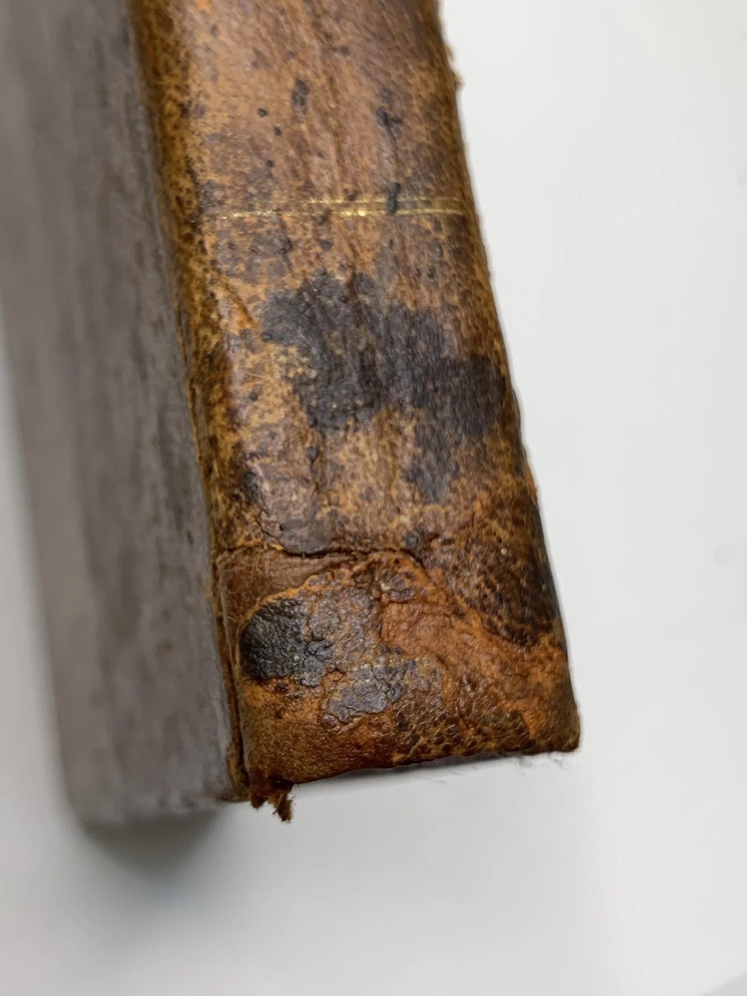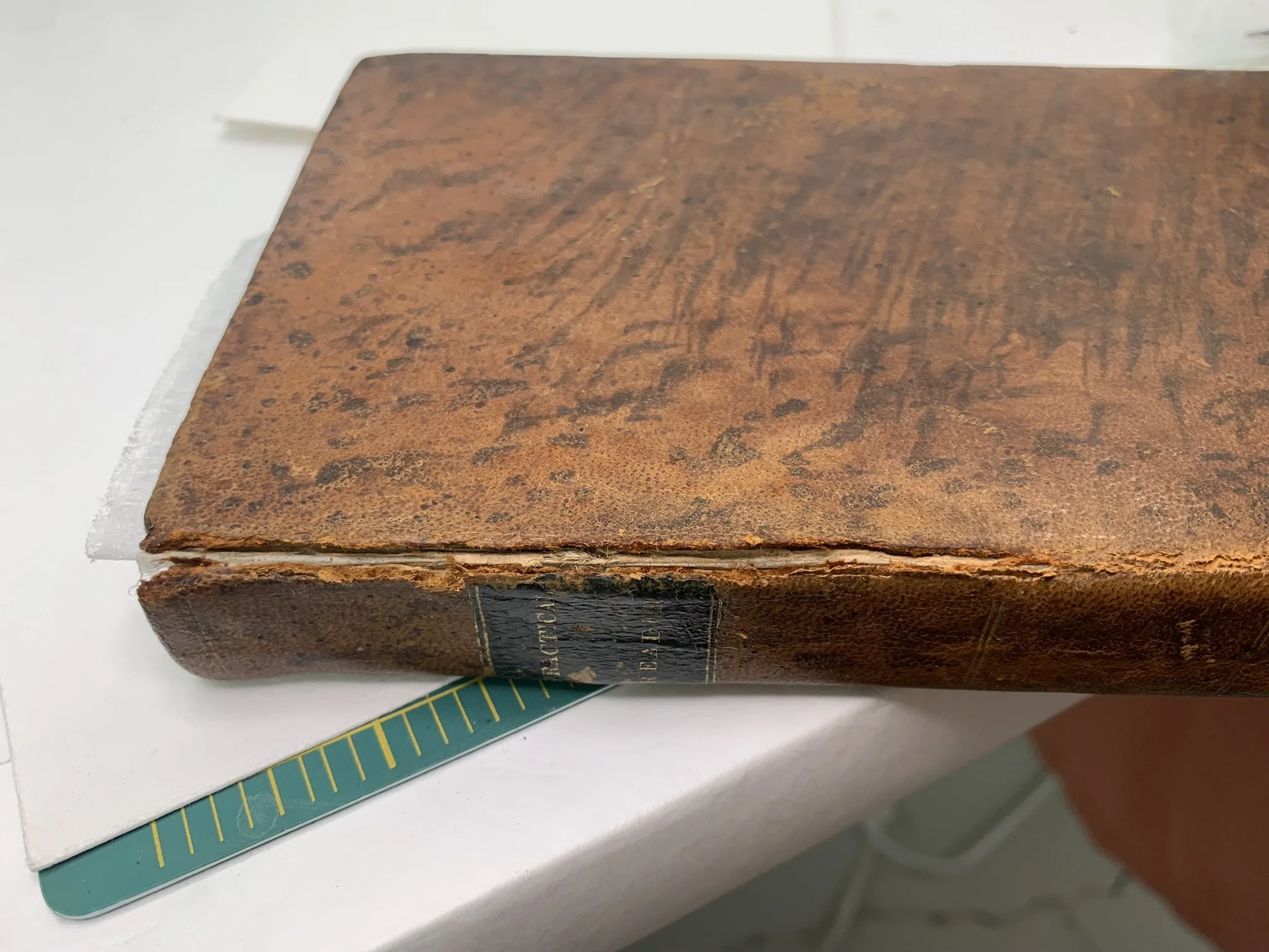 A leather bound book from the schoolhouse in the open air campus, Greenfield Village, the book’s spine split along the outer joint and the leather lifted off the spine. The leather was first consolidated with Klucel G in alcohol. The repairs carried out are described below.